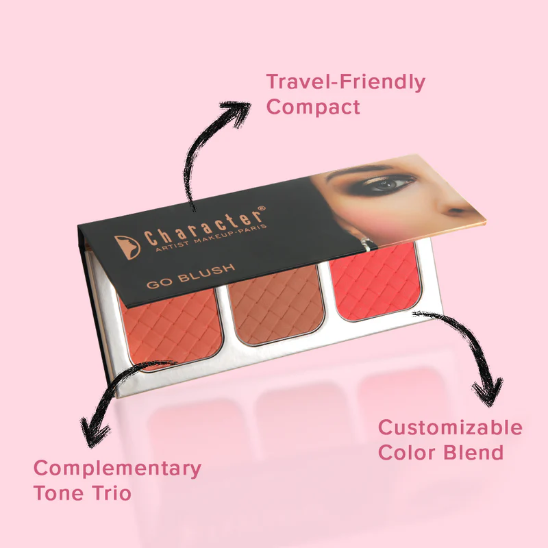 Character Go Blush palette consists of 3 matte and shimmery blush shades which come in 6 variants. These intensely pigmented powder blushers easily glide on giving you a natural finish. Suitable for all skin tones? YES, so grab yours now! Go blush with a natural flush!