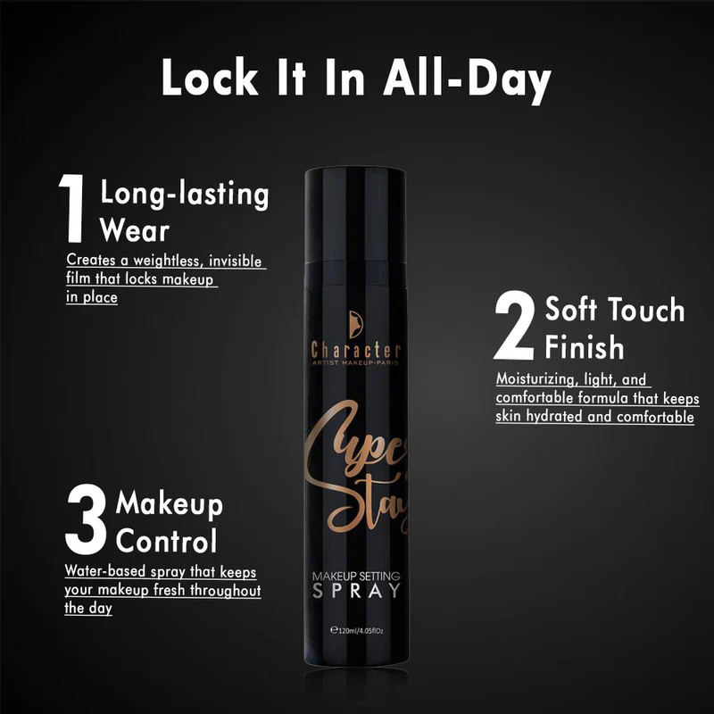 Character's super stay makeup setting spray is a light and comfortable setting spray that seals the makeup and keeps it in place by coating the skin with a weightless and invisible film. It is a water-based spray with makeup fixing action that will prepare the skin for your beauty routine.