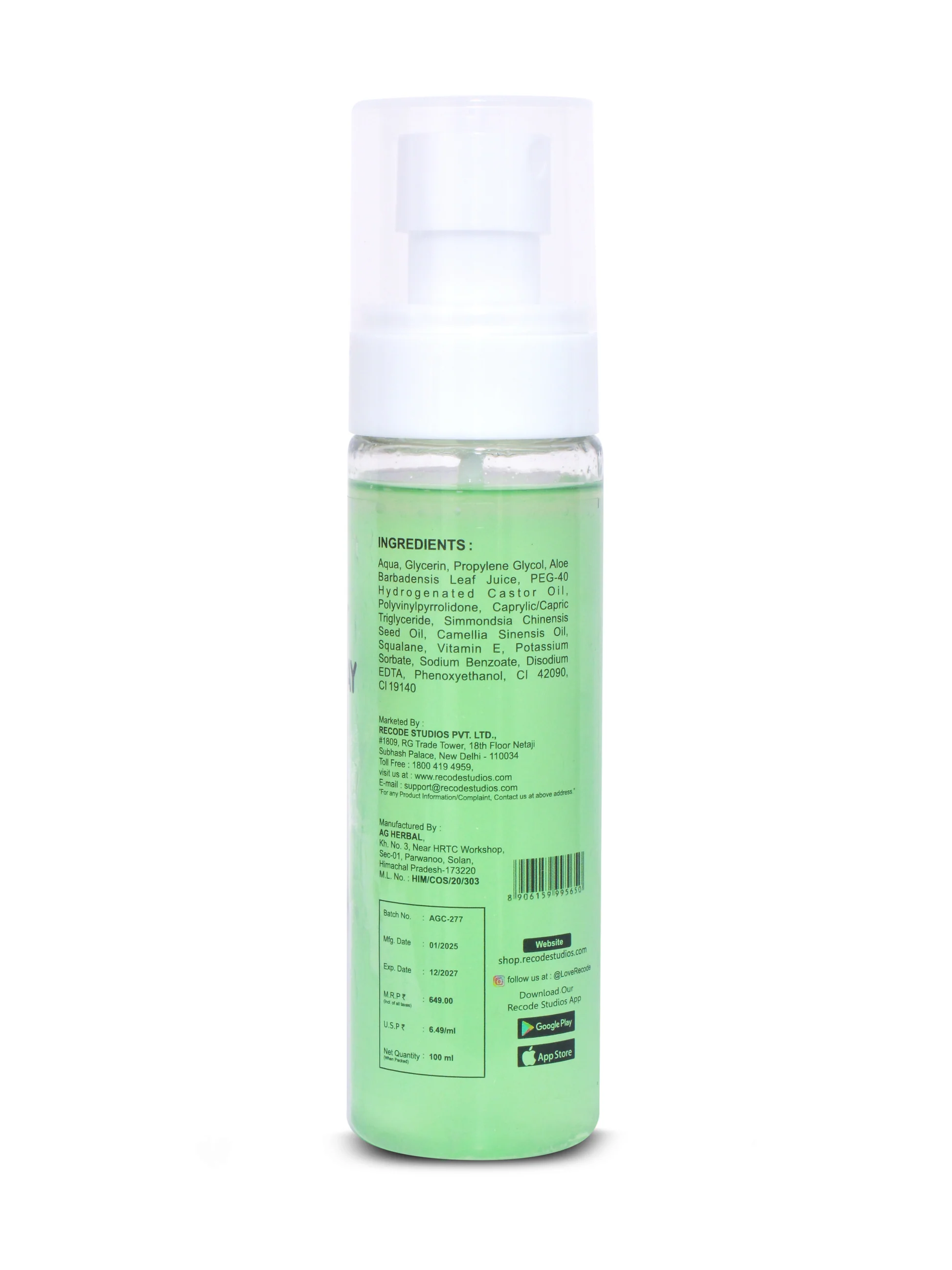 Aqua, Glycerin, Propylene Glycol, Aloe Barbadensis Leaf Juice, PEG-40 Hydrogenated Castor Oil, Polyvinylpyrrolidone, Caprylic/Capric Triglyceride, Simmondsia Chinensis Seed Oil, Camellia Sinensis Oil, Squalane, Vitamin E, Potassium Sorbate, Sodium Benzoate, Disodium EDTA, Phenoxyethanol, CI 42090, CI 19140