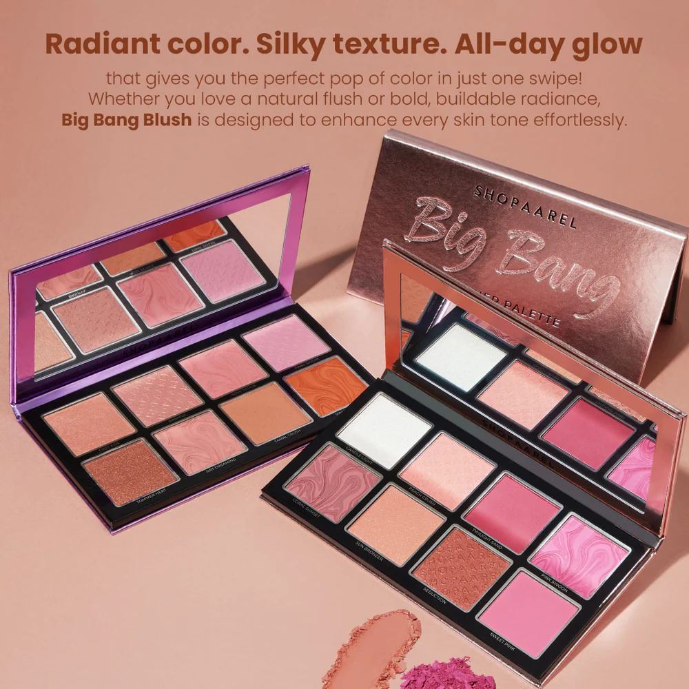 Introducing our new palette Discover the ultimate blusher experience with the Shopaarel Big Bang Palette. Designed to enhance all skin tones, this 8-color palette offers a luxurious blend of matte and shimmer finishes, ensuring a flawless touch of color with every application. The smooth, highly pigmented textures glide effortlessly over the skin, delivering a soft and radiant glow that lasts all day.